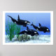 Zwei weibliche und eine männliche Killerwale jagen gemeinsam im schönen klaren Meer.