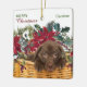 Hier ist ein hübsches Holiday-Ornament, das ein großartiges Geschenk für ein Enkelkind, einen Sohn, eine Tochter oder jemanden machen würde. Auf beiden Seiten des Ornaments befindet sich ein Korb aus roten Poinsettienblüten, weißen Blume und Kiefernholz. In der Mitte sitzt ein bezauberndes kleines Schokolade Labrador Retriever Welpe. Die Vorderseite hat grünen und roten Text, der sagt "Frohe Weihnachten, und einen Namen. Die Rückseite hat Ihre Unterschrift und das Jahr.