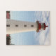 Leuchtturm bei Point Prim auf Prince Edward Island, Kanada gegen bewölkten blauen Himmel am sonnigen Tag.