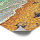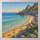 Hochwertige Grafik eines Pointillismus-Gemäldes einer ruhigen Küstenlandschaft mit einem ruhigen Meer, einem sandigen Strand und einer felsigen Klippe, die alle aus unzähligen winzigen, unterschiedlichen Punkten reiner Farbe entstanden sind.