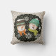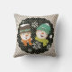 Snowmen Dots and Stripes coussin de vacances, si joli et coloré, dispose d'un arrière - plan à rayures diagonales blanc et gris avec un cercle noir avec des points blancs et chaque côté a un couple de bonhomme de neige souriant avec un casquette, foulard, nez de carotte et flocons de neige!