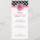 Menu élégant de réception de mariage fait dans le blanc, avec un motif de point noir et blanc de polka, sur le dessus et la bâche le dos de l'invitation. Les graphiques d'un ruban rose, avec une marguerite de Gerber de rose décore le milieu du ruban. Le texte dans le noir et le rose est prêt à personnaliser pour votre réception de mariage. Joli menu avec un contact lunatique.