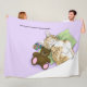 Un tabby orange dormant sur un coussin avec une couverture violette derrière, un ours en peluche et un jouet de poisson.
