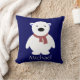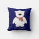 Le coussin mignon pour la pièce de petit enfant, ours blanc avec l'écharpe rouge sur l'arrière - plan de bleu marine, personnalisent avec le nom de l'enfant ; De retour du coussin est marine être assortie mignonne et pois blanc