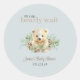 Polar Bear Cub Blue Winter Baby Shower Sticker. Dieser wertvolle Eisbärenkub ruht sich auf einem Bett aus Eukalyptus und Kieferngrün mit einem sanften Glühen von Sprinklern aus. Koordination der Babydusche Party Dekoration und Schreibwaren in der Boho We Can Bearly Wait Winter Baby Shower Collection.