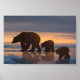 Eine Mutter, ein Eisbär und ihr Junge überqueren den Eisfluss, wobei die arktische Sonne hinter ihnen untergeht. Computerkunst von Kathie Miller.