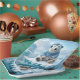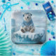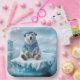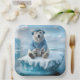 Ein Eisbär, der einen blauen Pullover, Ohrmuffe und einen Eisberg trägt, während er eine Zeitung mit dem Titel "Polar News" hält.