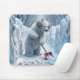 Ein Eisbär, der mit flauschigen Ohrmuffen ausgerüstet ist, schneebedeckt einen schmalen, schneebedeckten Weg in einem sanften Schneefall