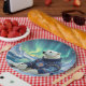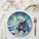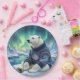 A polar bear, wearing a colorful sweater, sits on an ice floe as the aurora borealis illuminates the sky, creating a magical backdrop