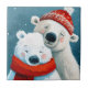Dieses Bild zeigt zwei Eisbären in einer herzzerwärmenden Umarmung, Set vor einem schneebedeckten, aquamarinen Hintergrund. Der größere Bär trägt einen roten Strick, der mit feinen Motiven geschmückt ist, während der kleinere Bär in einen kräftig roten Schal eingewickelt ist. Beide Bären haben sanfte, rosige Wangen und ruhige Ausdrücke, die eine gemütliche und liebevolle Winteratmosphäre schaffen. Der strukturierte, malerische Stil verstärkt die Wärme und den Charme der Szene.