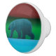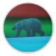 Ein Eisbär wandert in der langen Polarnacht durch das Eis; die Nordlichter in rot und grün leuchten in der Ferne.