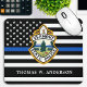 Thin Blue Line Police Department Mouse Pad - Amerikanische Flagge in Polizei Flag Farben, moderne schwarz und blau Design . Passen Sie sich mit Ihrem Abteilungslogo an und personalisieren Sie die Personalisierung mit dem Namen der Polizeibeamten. Dieses personalisierte Mousepad der Strafverfolgungsbehörden eignet sich perfekt für Polizeidienste und Strafverfolgungsbehörden. COPYRIGHT © 2020 Judy Burrows, Black Dog Art - Alle Rechte vorbehalten. Polizeiabteilung - Mauspad für die Rechtsdurchsetzung von Logos