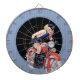 Der Fun Pinup mit Vintager Cheesecake-Dartboard-Design verfügt über eine Retro-Polizeifrau auf einem Motorrad mit blauem und schwarzem Hintergrund.
