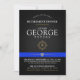 Feiern Sie einen Polizeibeamten, wenn sie entweder als Absolvent der Polizeiakademie anfangen oder seine Reise als Rentner beenden. Diese schwarze Einladungskarte weist eine dünne blaue Linie über die Mitte und einen Platz für den Personennamen und das Monogramm in elegantem Text auf. Auf der Rückseite der Einladung sind goldene Button-Streifen vor schwarzem Hintergrund. Eine passende Gestaltung für jede polizeiliche Veranstaltung, einschließlich eines Firmenevents, eines Abendessens, einer Pensionierung, einer Gedenkfeier oder eines Abendessens zum Abschluss eines derzeitigen oder pensionierten Polizeibeamten.