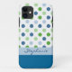 Schützen Sie Ihr iPhone 5 in diesem hübschen Fall. Mit einem echten Mädchen-Look, ist dieses Gehäuse in Weiß gemacht, mit einem grünen und blauen Polka-Punkt-Muster, oben, und ein massives Blau auf dem Boden des Gehäuses. Ein hellblauer Streifen verläuft in der Mitte, mit benutzerdefiniertem, blauen Skripttext. Personalisieren Sie diesen hübschen Schlag für sich selbst oder als großartige Geschenkidee.