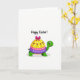 This greeting card features a friendly green turtle-like character centered along the lower half of a white background, smiling with big, gentle eyes that give it an affectionate, companionable look. Its rounded shell is styled like a tiered celebration display, suggesting a sweet shared moment rather than a solo pose. The top tier is sunny yellow with small white dots and tiny pink tulip-shaped flowers, followed by a bright pink middle tier with matching white dots. The bottom tier is purple with neat white ring patterns, and a large fuchsia bow sits on top like a gift-ready accent. Near the top of the card, the words “Happy Easter!” appear in a flowing, casual style in a dark tone, centered above the character. A few spring touches, like 🌷-shaped blossoms on the shell, add a soft seasonal cue, and a small 🐰 or 🐇 emoji would fit naturally beside the greeting. The white space around the turtle keeps the focus on the stacked shell colors and the bright bow, with the pink flowers and white dot details clearly visible.
