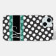 Ein klassisches schwarz-weißes Polka-Punktmuster mit einem Platz für Ihr Monogramm. Es ist mit einem aquamarinen grünen Streifen versehen, der für ein modernes, sauberes Design für jede Frau sorgt.