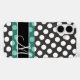 Ein klassisches schwarz-weißes Polka-Punktmuster mit einem Platz für Ihr Monogramm. Es ist mit einem aquamarinen grünen Streifen versehen, der für ein modernes, sauberes Design für jede Frau sorgt.