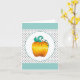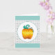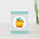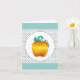 Niedliche fallbezogene Grußkarte mit klassischer Abbildung eines leuchtend orangefarbenen Kürbis, komplett mit lockigen Stielen und Blätter, vor einem Polka Dot Hintergrund mit aquamarinen Akzenten. Leere im Inneren.