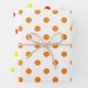 Maßgeschneidertes Verpackungspapier mit großen Polka-Punkten in hellen Farben: orange, gelb und rot. Weißer Hintergrund.