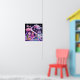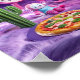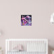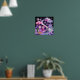 Dieses Poster zeigt eine skurrile Fantasiewelt mit einer Wendeltreppe aus weißen Treppen, die auf schwarzem Hintergrund aufsteigen. Die Treppe ist mit angehängten Silbersterndekorationen und flauschigen rosa und lila Pom-Pom-Wolken geschmückt. Ein rosa Schaukelstuhl sitzt im Vordergrund mit einer kleinen Puppe, die ein hellblau und rosa Kleid trägt. Eine große rosa analoge Uhr mit schwarzen Zahlen und Händen steht zum links Stuhl. Vor der Uhr steht ein grüner Kaktus in runder Form. Ein türkisfarbenes Kissen mit einem Flickenteppich aus rosa, blauen und gelben Quadrat-Erholungen in der unteren rechten Ecke. Auf dem lila Boden befindet sich eine kleine runde Platte mit bunten Köstlichkeiten. Eine kleine Lavendelpuppe hängt von einer silbernen Stern-Dekoration. Die Szene ist mit verschiedenen lila und rosa flauschigen Elementen geschmückt, darunter eine große rosa Pom-Pom-Wolke mit googly eye. Die Farbgebung besteht aus Rosa, lila, Silber und Schwarz und schafft eine magische, traumhafte Atmosphäre.
