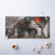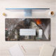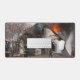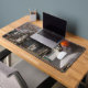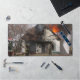 Un tapis de bureau avec une photo de pompiers combattant un incendie de maison.