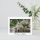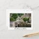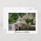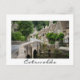 Carte postale du pont sur la rivière Bybrook dans le petit village pittoresque de Castle Combe avec des maisons construites en pierre couleur miel dans les Cotswolds, Angleterre, Royaume-Uni avec une bordure blanche et le texte : 'Cotswolds'.