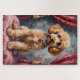 This elegant watercolor features a gracefully posed apricot Poodle wearing a pearl necklace with a ruby heart pendant, set against luxurious red velvet drapes. A sophisticated and charming Valentine's Day gift for Poodle owners.