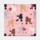 Niedliche Valentinstag-Poodles mit schwarz, weiß, grau, aprikot und braun farbigen Mäntel in Rot, Rosa und Weiß-Polka-Dot und Pullover mit verstreuten Pfotendrucken und Pfeil auf einem rosa Hintergrund.