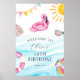 Birthday Pool Party Willkommensschild mit einem Hintergrund von blauen Wellen und einem rosa Schwimmbad. Passen Sie Ihre Informationen an, damit die Mama zu sein hat. Klicken Sie auf "Klick um weitere Anpassungen vorzunehmen", um den Stil, die Größe oder die Farbe des Schriftartes zu ändern.