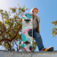 Maßgeschneiderte Retro 90er Jahre geometrisches Design Skateboard in türkis, schwarz, weiß und heiß rosa Spray Farbe.