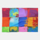 Ein künstlerisch inspiriertes, dynamisches Pop-Muster mit einem Raster von bunten Quadraten, die jeweils mit einem lebhaften Farbspritzer, Grunge-Texturen und abstrakten Pinselstrichen bestückt sind.