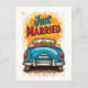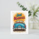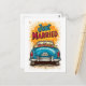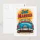 Diese Postkarte zeigt eine lebendige Pop-Kunstillustrierung eines Vintagen Cabrio-Autos, das von hinten betrachtet wird und für eine Hochzeitsfeier freundlich dekoriert ist. Über dem Auto ragt die Phrase "Just Married" in fett gedruckten Blockbuchstaben im Stil eines Comic, Set vor einem Hintergrund heller, fröhlicher Farben. Nehmen Sie ein paar davon auf Ihrer Hochzeitsreise mit, um sie an Familie und Freunde zurückzuschicken.