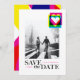 Eine modische, designgeführte Save the Date-Fotokarte mit einem hellen FarbenPop im CMYK-Druckstil.