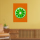 Eine niedliche und farbenfrohe, grüne Limone Fruchtscheibe aus einem Originalgemälde der Künstlerin Sacha Grossel. Dieses große Fruchtstück im Pop ist grün, sehr hell und farbenfroh, vor einem leicht orangefarbenen Hintergrund. Quirkisch und originell.