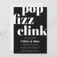 Les invitations aux fêtes de fiançailles modernes et minimalistes présentent un style chic noir et blanc avec un "clink pop fizz" dans des lettres rétro blanches surdimensionnées. Personnalisez avec les détails de votre célébration fiançailles sous. Les invitations se retournent vers un motif d'étoiles colorées en noir sur blanc.