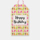 Ein glücklicher Geburtstagsgeschenk-Tag mit einem Bild eines sommerlichen Musters mit Popsikeln und Eis in Aquarellen. Farbenfrohe, lebendige Farben wie Rosa und Kalkgrün.