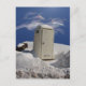 Ein modernes tragbares Outdoor-Haus sitzt an einem hellen Wintertag gefroren in einer Schneeabdrift, gewartet, um zu dienen.