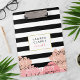 Le porte - bloc personnalisé chic est doté d'un arrière - plan rayé noir, d'une bordure en faux or et d'un groupe de pivoines aux tons joliment broussailles avec votre nom, nom de société ou choix de personnalisation au centre. Le design se répète à l'envers.