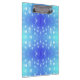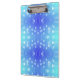 A clipboard featuring a blue and teal bokeh pattern, with round white dots giving it a soft, calming effect. The metallic clip is shiny and reflective.