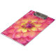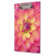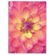 Un dahlia aux couleurs vives en corail, rose et or. Les pétales sont agrémentés de gouttes d'eau.
