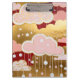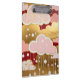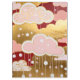 This artwork is a lavish, decorative exploration of a stylized sky, blending opulent gold leaf textures with a deep, dramatic crimson backdrop. It features whimsical, rounded clouds in shades of pastel pink and speckled gold, layered to create a sense of depth and luxury. From these clouds, delicate white lines descend like threads, carrying circular "raindrops" in white and soft pink, which give the piece a rhythmic, jewel-like quality. The overall aesthetic is one of ornate elegance, combining modern graphic shapes with a rich, classical color palette.