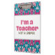 "Je suis un enseignant, pas un sniper" Porte - bloc avec un message pour les enseignants qui ne veulent pas d'armes dans leurs salles de classe. Arrière - plan en mosaïque florale en bleu et rose