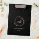 Le porte - bloc chic présente vos initiales ou monogrammes en script de calligraphie à l'intérieur d'un élément de cercle abstrait en feuille d'or rose sur un arrière - plan noir riche. Personnalisez avec deux lignes de texte personnalisé sous. Le design se répète à l'envers.