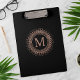 Un porte - bloc élégant et personnalisé présente un design noir élégant avec un médaillon en or rose en monogramme à l'avant et à l'arrière. REMARQUE : L'or rose est un effet imprimé avec des variations de couleur faites pour imiter le papier d'aluminium réel ; il n'est pas du papier d'or réel.
