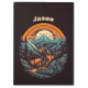 Vie cycliste, peinture rétro en orange et bleu d'un cycliste à travers les montagnes et la forêt avec le soleil en arrière - plan