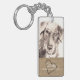 Arrière - plan rustique avec une image naturelle de toile de jute sur laquelle est le nom de votre animal familier et du message suivant : "Pour toujours à nos coeurs". Un coeur encadre le nom de votre animal familier et une légère ombre de baisse donne un sens de profondeur. Porte - clé personnalisable de mémorial d'animaux familiers.