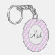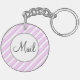 Un porte - clé pour votre boîte aux lettres avec des lettres de script sur un motif rayé rose avec de fines rayures grises sur blanc.