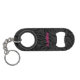 Un imprimé léopard noir sur charbon amusant recouvre cet ouvre-bouteille porte-clés personnalisé avec votre nom imprimé en lettrage rose chaud chic sur l'avant et l'arrière.
