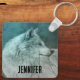 Porte - clé personnalisé avec une photo d'un magnifique loup gris et velouté. Dans l'arrière - plan est une forêt sombre avec des arbres. Vibe mystique magique.